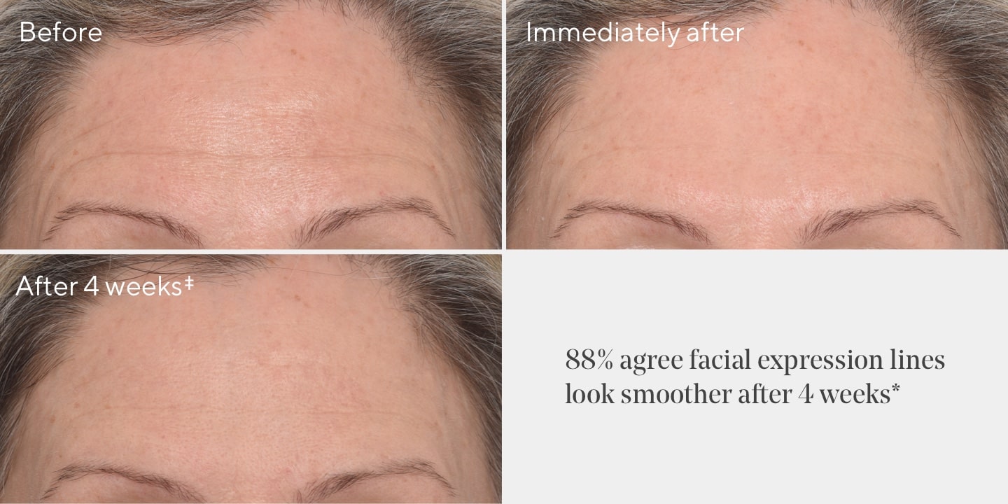 90% showed improvement in the look of forehead wrinkles and 100% showed improvement in the look of glabella lines (AKA elevens)†